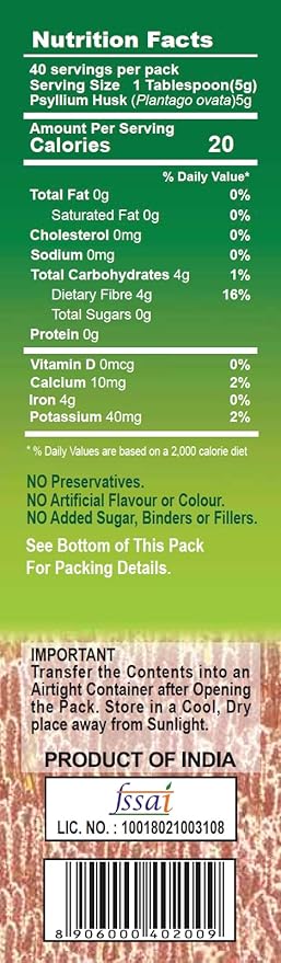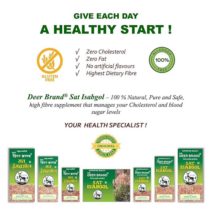 Deer Brand Isabgol a natural vegetable product is a highly pure form Plantago Ovata (Isabgol) is nature's highest soluble fibre derived from seeds. Processed in a state-of-the-art plant with a modern computerized sorting machine under stringent quality control measures. From the selection of raw materials to computerized cleaning, processing and packaging in a clean plant, utmost care is taken to bring you 100 percent natural, pure, safe and super quality set Isabgol. In indigenous medicine - Ayurvedic and Unani seeds and husk are used as emollient, demulcent and laxative and are used in the treatment of chronic constipation, amoebic and bacillary dysentery and diarrhoea. The efficacy of psyllium is due to a large amount of mucus, whose action is purely mechanical because the husk dries into a jelly-like mass with fluid. Psyllium Husk, used as a dietary supplement, has helped reduce human serum cholesterol levels. Consumption of natural fibre is known to help in the effective control of diabetes. Comes in 100 g pack.