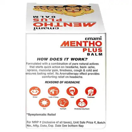 Emami Mentho Plus Balm is a specialist in providing relief from 10 kinds of headache. Consumer studies show, headaches have various reasons, like exposure to sun, cold, lack of sleep, tension, stress, anxiety etc. Headache usually strikes quickly, without warning.