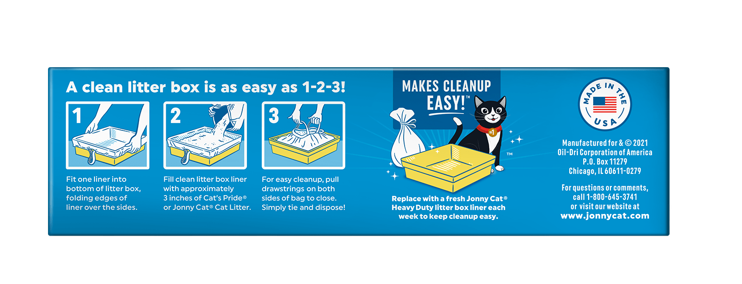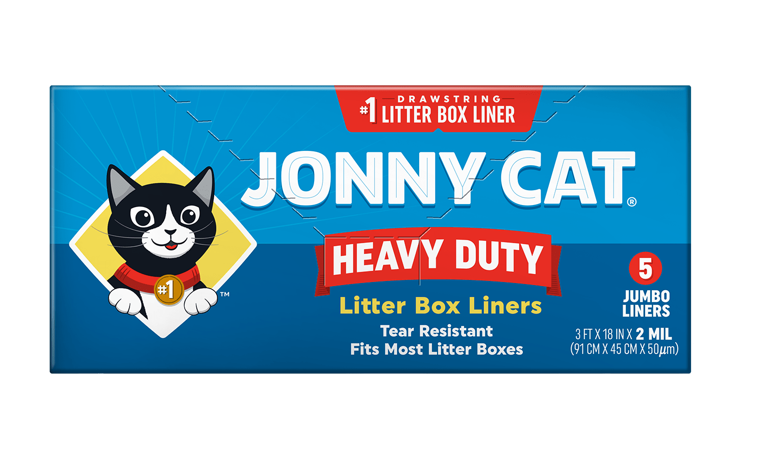 Jonny Cat Heavy Duty Litter Box Liners are the #1 selling liners in America. Our tear-resistant liners are 2 MIL thick so cats’ claws and paws can’t rip through them. With no waste or spillage stuck to the litter box, Jonny Cat Liners make cleanup easy! Simply pull the convenient drawstring, close, and dispose. No mess, no stress!