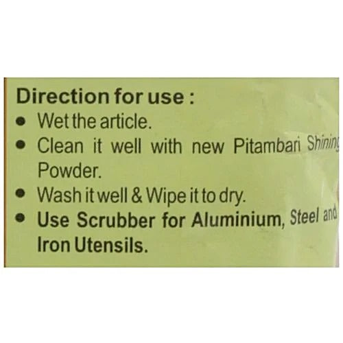 Pitambari Shining Powder is used to polish metals, namely copper, brass, aluminium, iron, silver, and steel. This powder is a must-have in every house as it will help keep items like decorative objects, antiques, and musical instruments looking new and polished. It removes the oxide layer easily from metal surfaces. Its diamond edge-cutting property gives a fast cleaning effect. No more scrubbing, no mess, no waste, easy to apply. It is effective on copper, brass, aluminium, steel, iron, silver, and other utensils. It cleans, protects, preserves, and restores the shine and lustre to a variety of different surfaces.