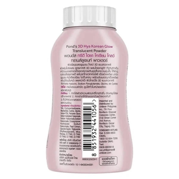 Pond's 3D Hya Korean Glow Translucent Powder: A 3D Hya powder that reveals smooth, pore-blurring skin and a 3D glow like a Korean girl. New! This Korean-formula 3D face powder from Pond's provides a beautiful, naturally glowing complexion. - Contains Hyaluronic Acid and Glutathione, known for their moisturizing properties that replenish and lock in moisture, revealing radiant, healthy-looking skin. - The translucent powder has a fine texture that helps conceal pores, creating a smooth, even complexion without caking or looking cakey, suitable for all skin tones. - Includes fine pearl shimmer to add dimension to the face, giving a naturally radiant glow. Achieve a flawless, smooth complexion with blurred pores and a healthy, 3D glow like a Korean girl. (Ingredients mentioned: Hyaluron, Sodium Pyroglutamate, Glycine, and Cystine)