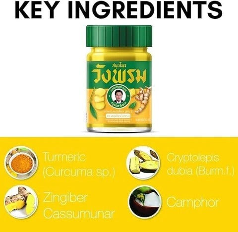 Wang Prom Yellow Herbal Massage Balm provides relief from aches and sprains, featuring a cooling sensation for external use.