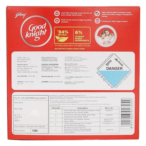 Goodknight Green Shakti coil gives you upto 12 hours of protection from mosquitoes spreading diseases like malaria, dengue, chikungunya. Active Filter Technology ensures that the coil burns virtually without smoke. Power formula ensures stronger, long lasting protection