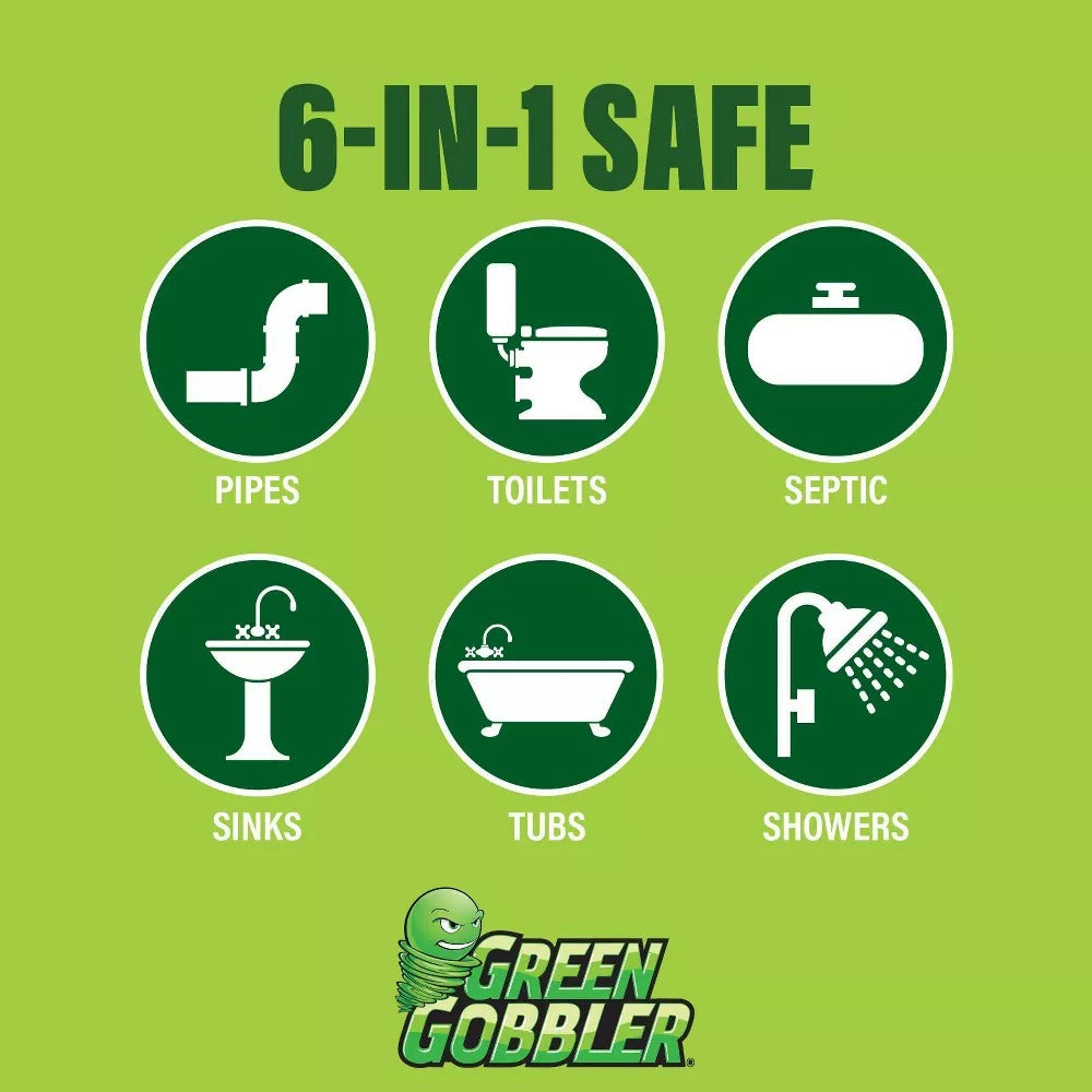 When slow-moving drains become a problem, it's time to send in Green Gobbler. Green Gobbler Drain Clog Dissolver cuts through the toughest clogs like soap scum, organic matter, toilet paper, grease and flushable personal care products to keep your pipes flowing properly. The high density formula sinks through standing water to reach your problem areas.