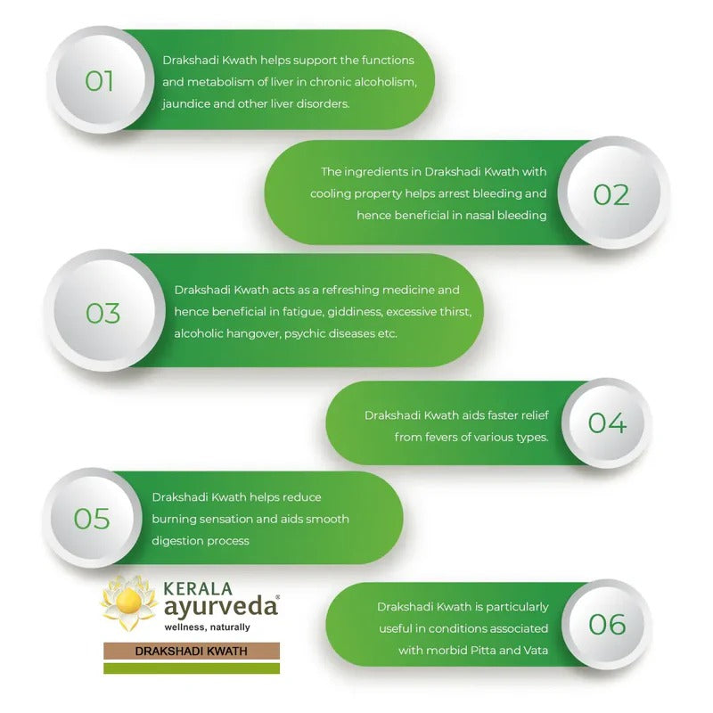 Drakshadi Kwath is a traditional Ayurvedic formulation that helps to restore the Kapha Pitta balance in the body. It contains key ingredients known to help in the Ayurvedic treatment of anaemia, belching, burning sensation, and fevers. It is named after the main ingredient Draksha which is grapes. It is said to be a good Ayurvedic cure for hangovers and helps the liver to metabolise alcohol. It is also hepatoprotective (protects the liver). It aids proper digestion and relieves flatulence and belching problems.